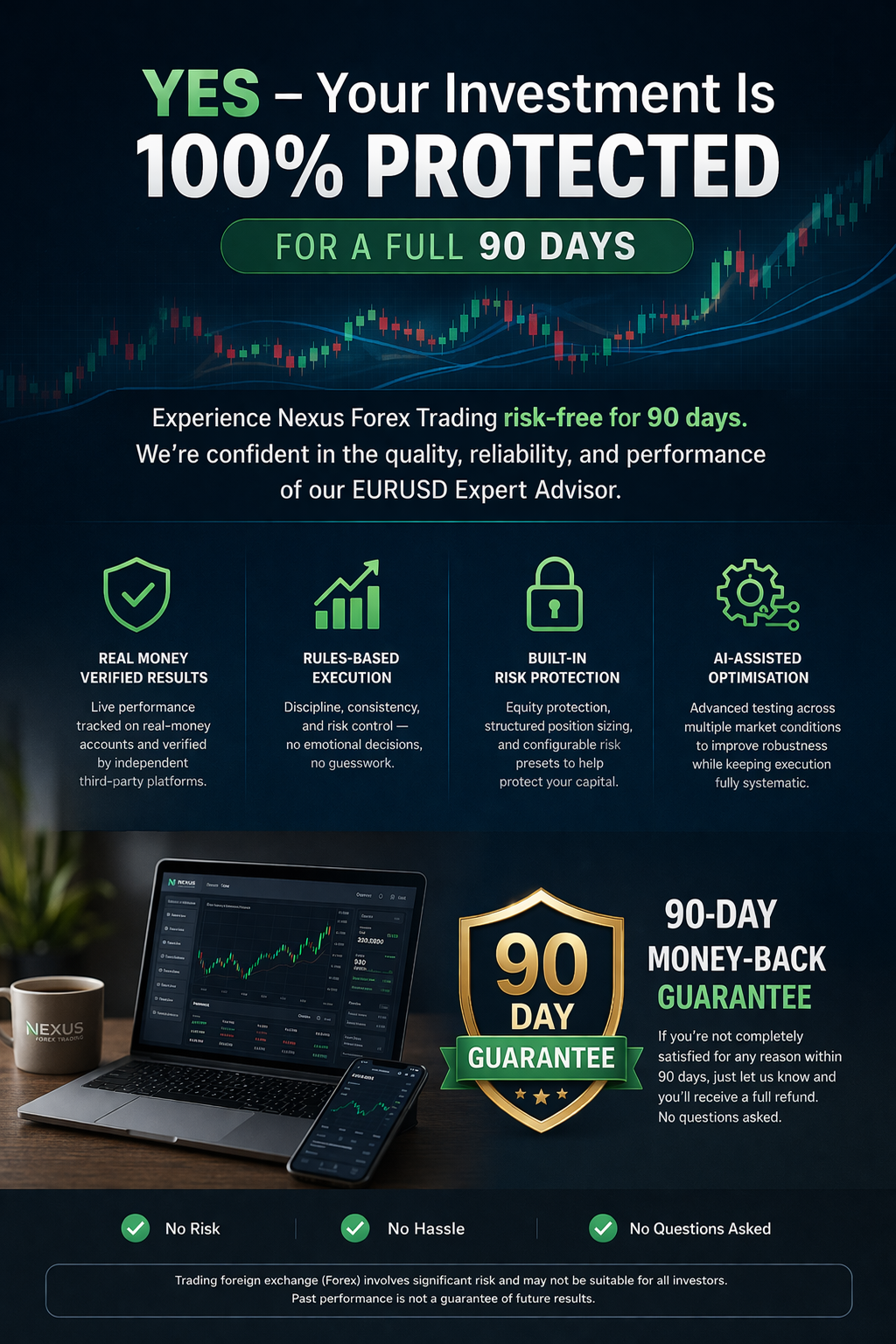 No Forex EA can guarantee profits or eliminate risk. Nexus is designed to reduce surprises, prioritise protection, and provide verified transparency—so you can run a disciplined, rules-based system with greater confidence.